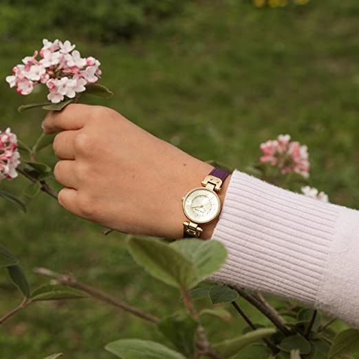 Watch size selection guide. This lovely Anne Klein watch exudes a classic and beauty that will never tire on your wrist. Gold metal case. Brown leather strap with adjustable buckle. Round dial. Quartz movement, three-hand analog display. The champagne dial features gold hour markers and hands, black minute track and Anne Klein detailing. Waterproof to 30 meters / 100 feet. import. Dimensions: Case Height: 26mm, Case Width: 26mm, Case Depth: 8mm, Strap Width: 12 7⁄10mm, Strap Circumference/Length: 8 1⁄2" Weight: 1 oz.
