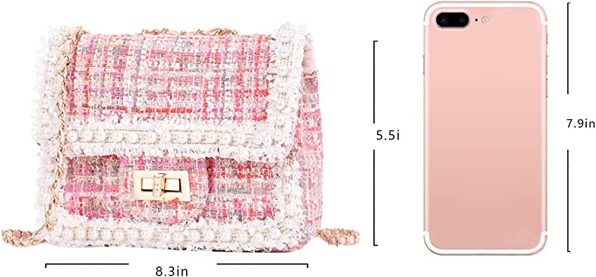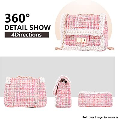 Qiayime Purse and Handbags for Women Fashion Tweed Pearl Top Handle Satchel Shoulder Tote bead chain Crossbody Clutch Bag